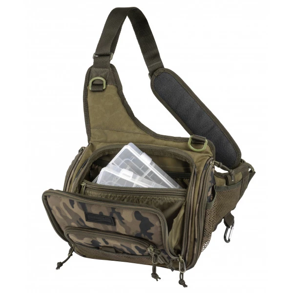 Sac à bandoulière très pratique pour les courtes sessions, avec finition en imprimé camouflage. Le sac offre suffisamment d’espace pour le petit matériel et dispose d’une section pliable en mousse EVA pour ranger les petits leurres. Le sac est livré avec 2 boîtes à pêche.